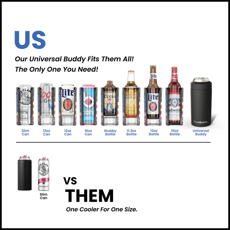 Say goodbye to your slim can or 12oz can cooler. Frost Buddy fits every 12oz can, slim can, 12oz bottle, & 16oz can / bottle all in one. It’s the only can cooler you need!